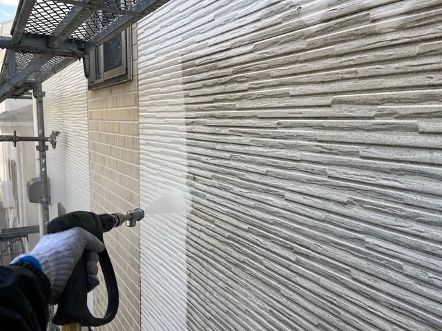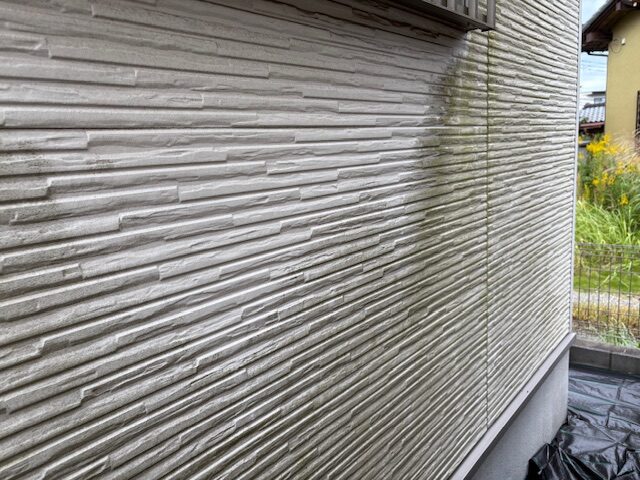 まず、塗装の前に高圧洗浄で、コケや汚れ、黒ずみ、旧塗膜等をしっかり落としていきます!高圧洗浄でしっかりと旧塗膜や汚れを落としておくことで、塗料の密着性を良くする効果を発揮できるからです。