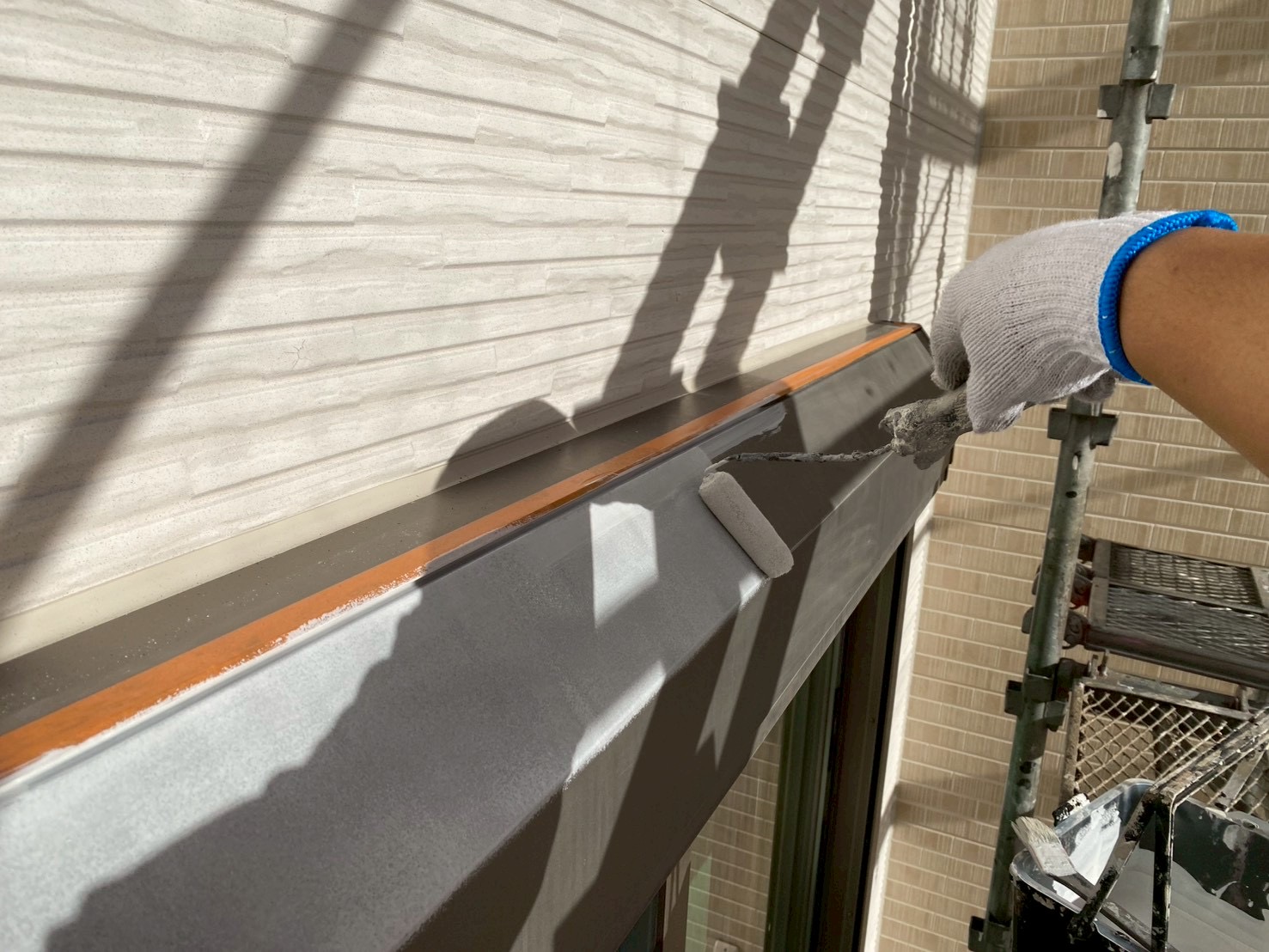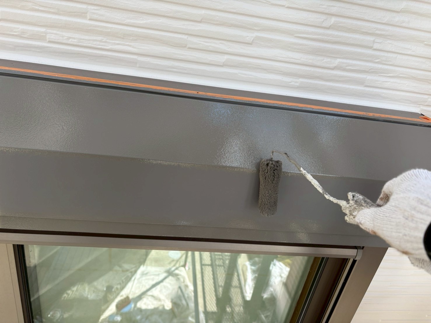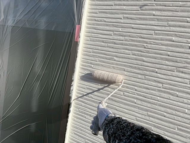 そして、いよいよ仕上げ塗りです。中塗りでしっかりと塗ったのに、経年劣化しており、傷みが激しい場合には、中塗りでもまだ下が透けてしまうように見えますね。そこで、もう一度、タップリと仕上げ塗りをします。