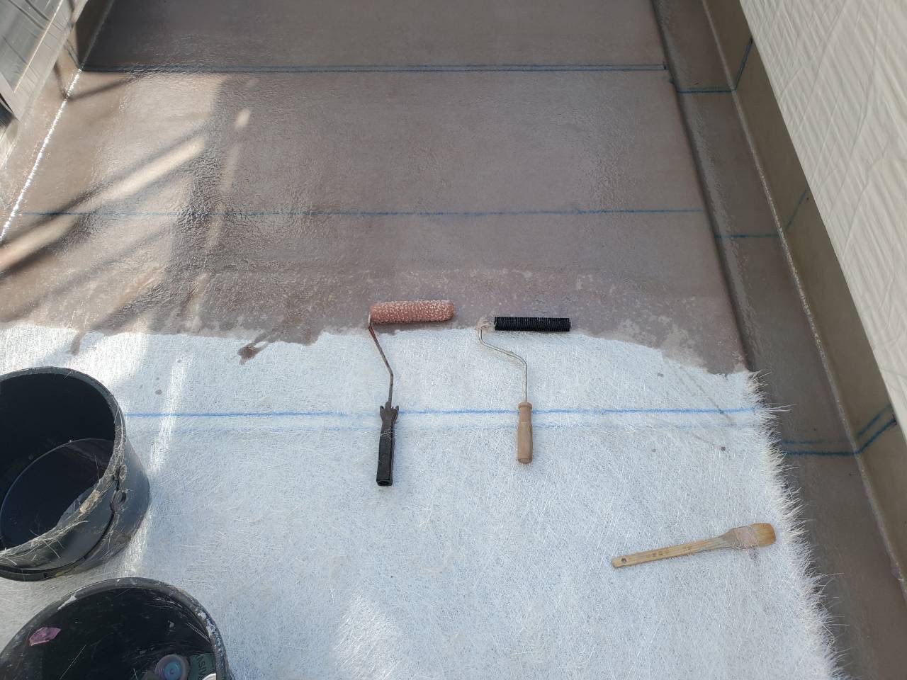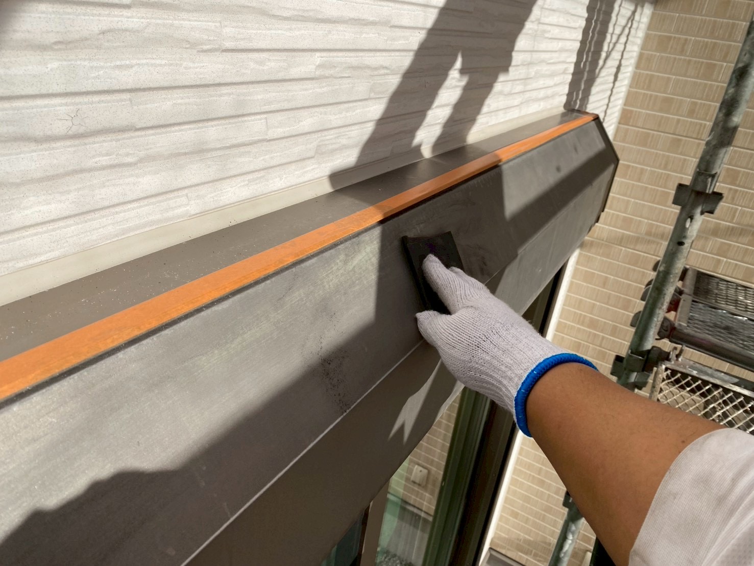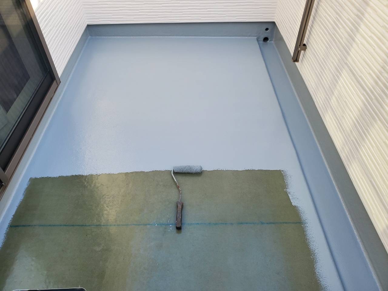 そして、いよいよ仕上げ塗りです。中塗りでしっかりと塗ったのに、経年劣化しており、傷みが激しい場合には、中塗りでもまだ下が透けてしまうように見えますね。そこで、もう一度、タップリと仕上げ塗りをします。
