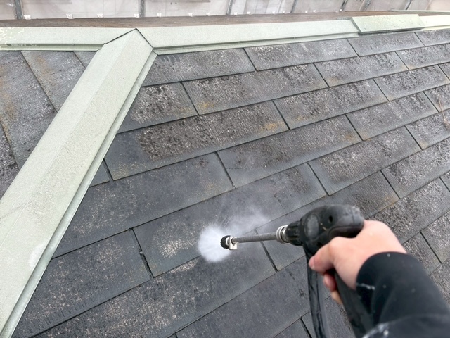 まず、塗装の前に高圧洗浄で、コケや汚れ、黒ずみ、旧塗膜等をしっかり落としていきます!高圧洗浄でしっかりと旧塗膜や汚れを落としておくことで、塗料の密着性を良くする効果を発揮できるからです。