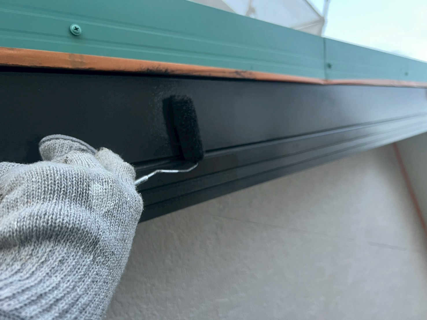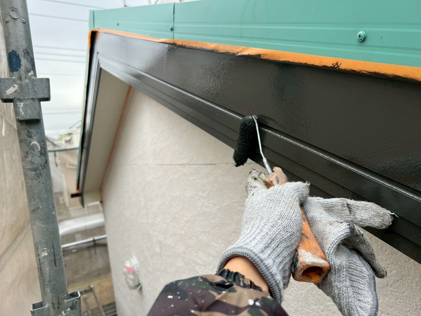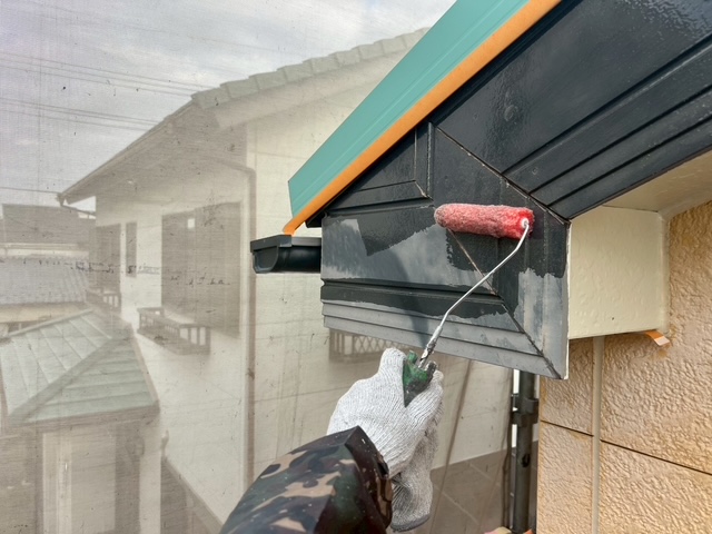 そして、いよいよ仕上げ塗りです。中塗りでしっかりと塗ったのに、経年劣化しており、傷みが激しい場合には、中塗りでもまだ下が透けてしまうように見えますね。そこで、もう一度、タップリと仕上げ塗りをします。