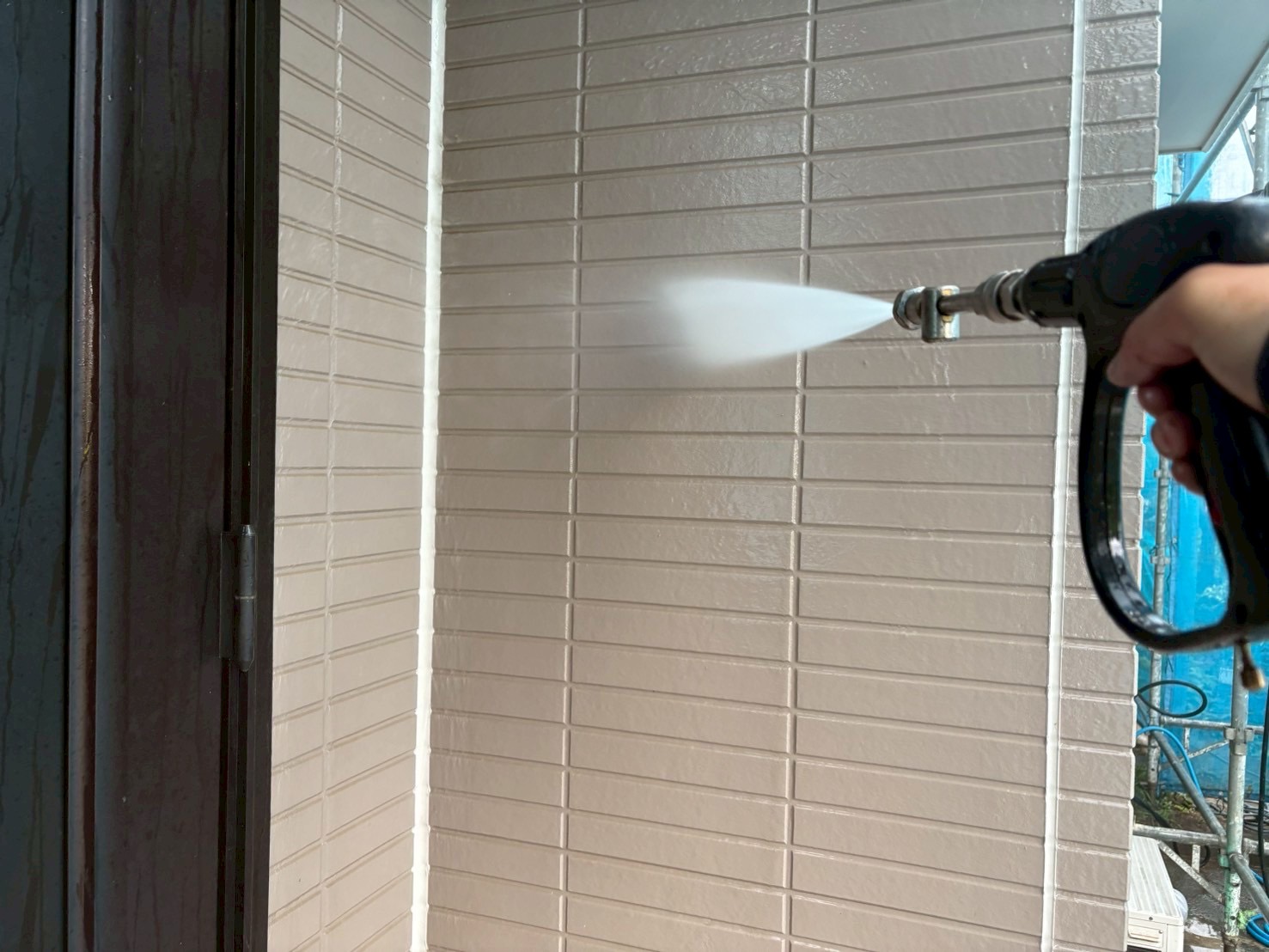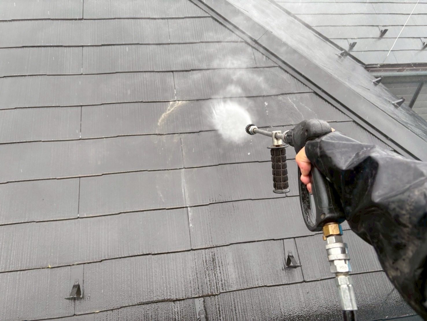 まず、塗装の前に高圧洗浄で、コケや汚れ、黒ずみ、旧塗膜等をしっかり落としていきます!高圧洗浄でしっかりと汚れを落としておくことで、塗料の密着性を良くする効果を発揮できるからです。
