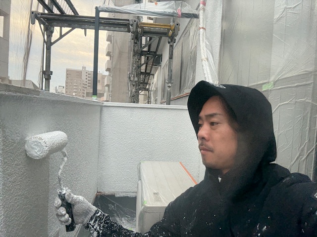 今日はアパートの外壁塗装!マスチックローラーという物を使って厚みをつけた塗装をしている様子です。