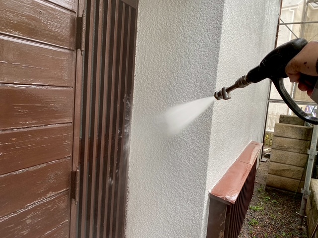 まず、塗装の前に高圧洗浄で、コケや汚れ、黒ずみ、旧塗膜等をしっかり落としていきます!高圧洗浄でしっかりと旧塗膜や汚れを落としておくことで、塗料の密着性を良くする効果を発揮できるからです。