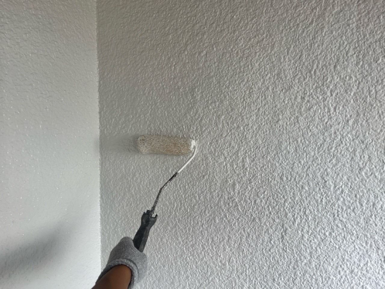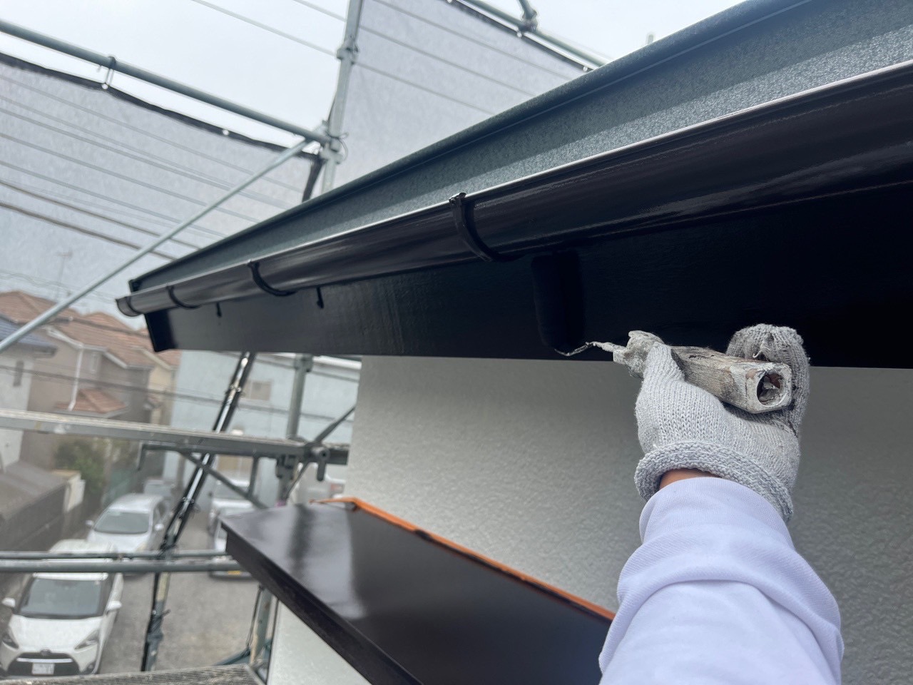 そして、いよいよ仕上げ塗りです。中塗りでしっかりと塗ったのに、経年劣化しており、傷みが激しい場合には、中塗りでもまだ下が透けてしまうように見えますね。そこで、もう一度、タップリと仕上げ塗りをします。