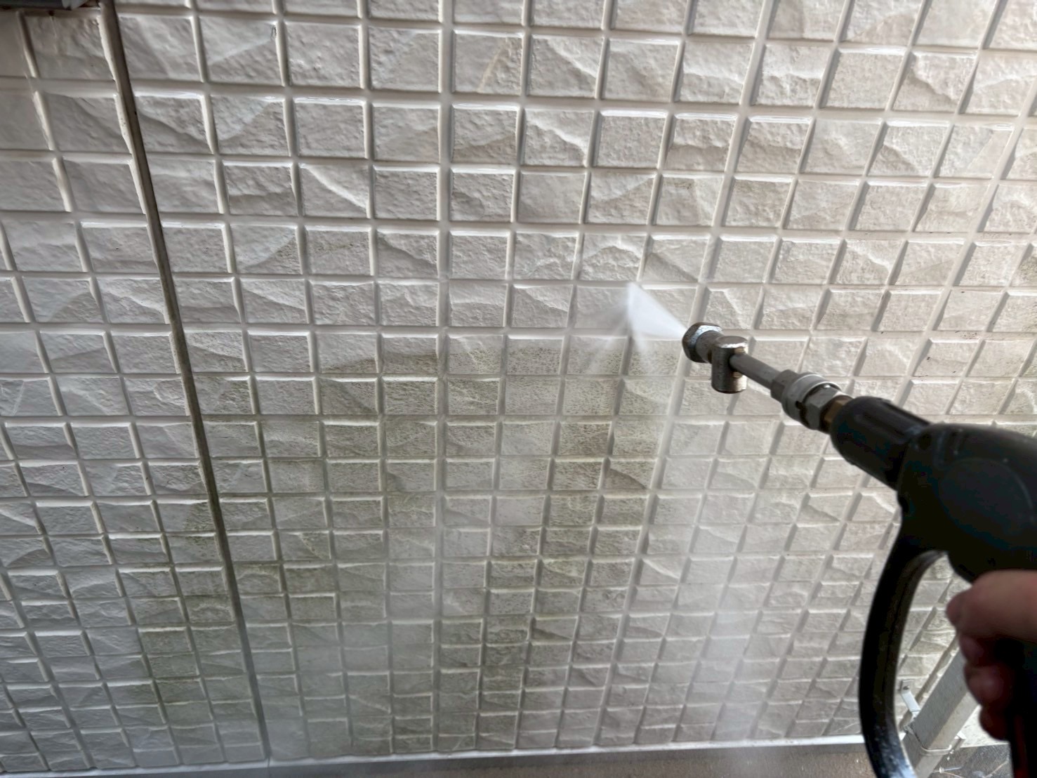 まず、塗装の前に高圧洗浄で、コケや汚れ、黒ずみ、旧塗膜等をしっかり落としていきます!高圧洗浄でしっかりと汚れを落としておくことで、塗料の密着性を良くする効果を発揮できるからです。